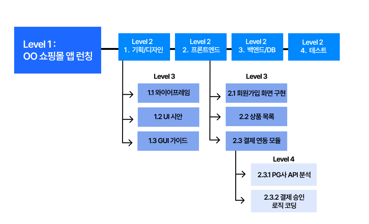 - Level 3 (하위 산출물 - 프론트엔드): 2.1 회원가입 화면 구현, 2.2 상품 목록 UI, 2.3 결제 연동 모듈