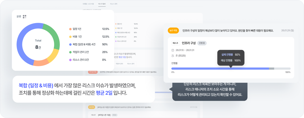 - 데이터 기반의 정교한 의사결정: 축적된 수치 데이터를 바탕으로 현재 프로젝트의 상태를 진단하고 향후 발생할 수 있는 리스크를 예측하여 프로젝트가 성공할 수 있도록 돕습니다.